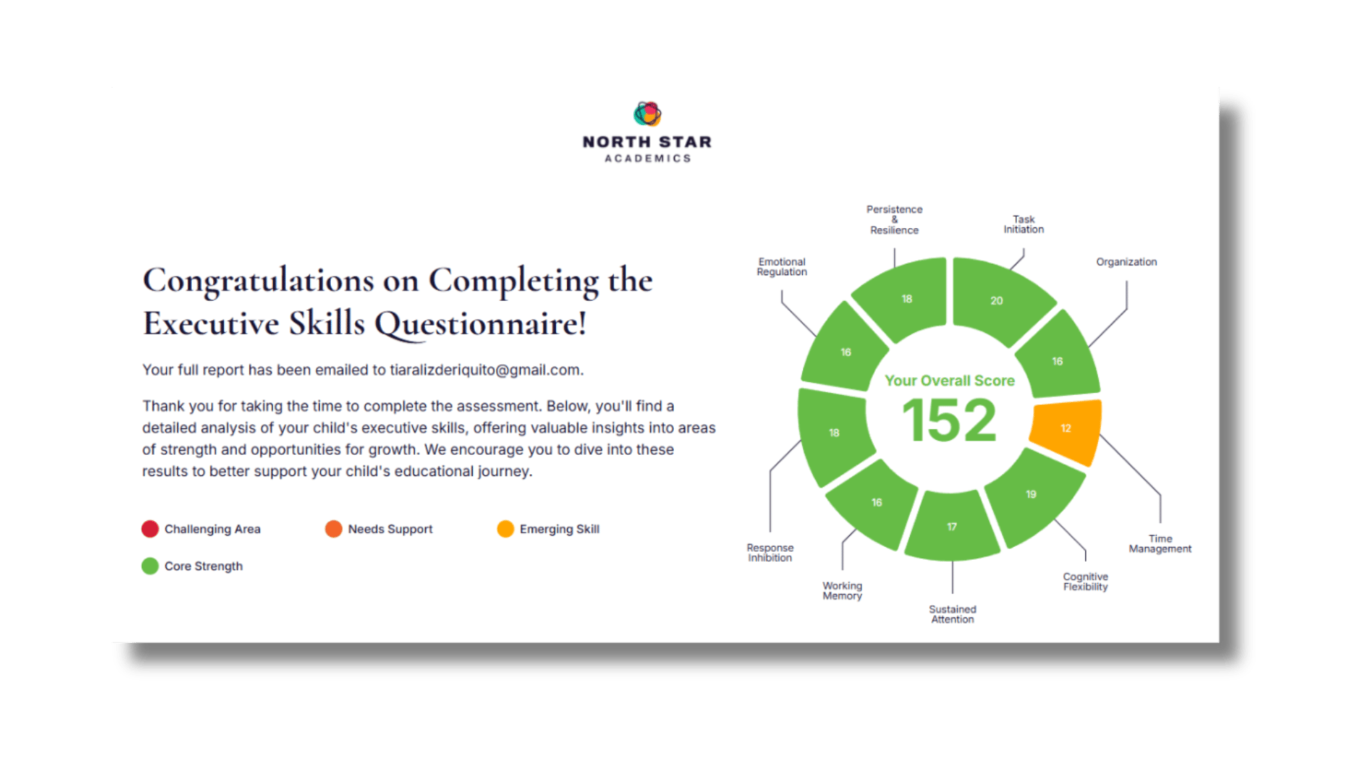 - You'll get instant, personalized insight into key executive functioning skill areas